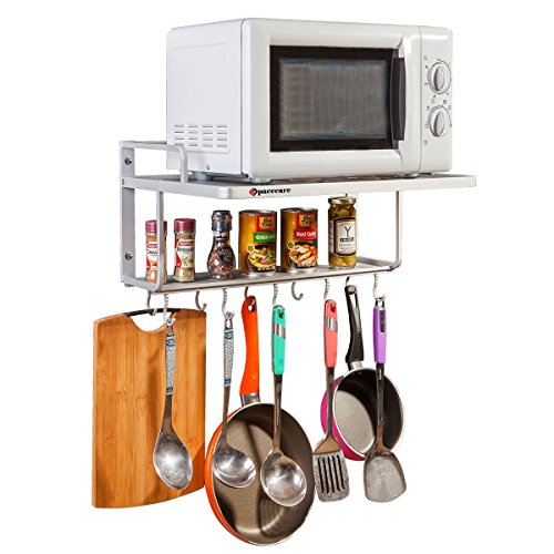THE SPACECARE MSHF004 Microwave Oven Wall Mount Shelf has double bracket that hollowed-out upper platform can put all kinds of microwave and the lower shelf can put cups,cruets and other microwave supplies.This product can hold your microwave on the wall and very clear for the decoration. Features